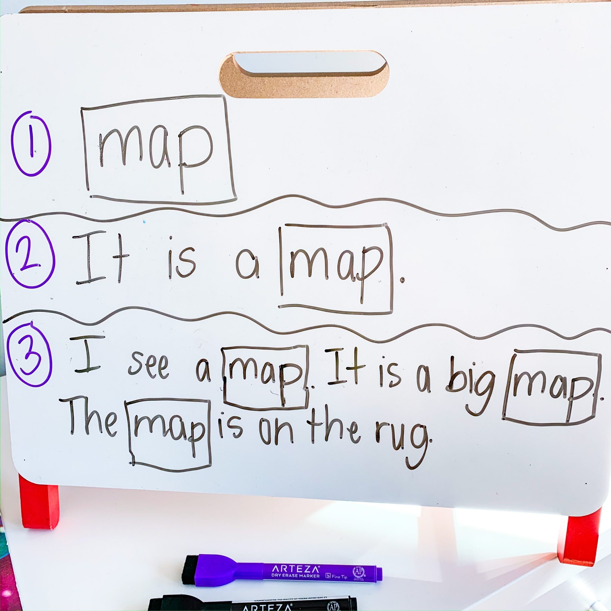 The last stages of this would be making a sentence with one of the real words for readers to read. Then a short story with 3 sentences, using some of the words. (Ex. The map is big. I like that mop. The mop is by the map.) You can guide readers as much as necessary with the sentences and short story. Remember- you want to build that confidence as they’re putting all the pieces together!