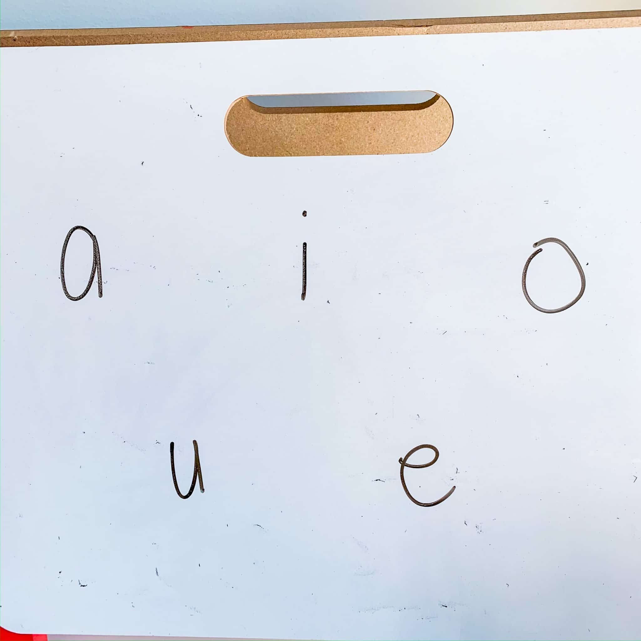 Next, have each group member write the vowels down on their own board. Then they can point to each letter and say the sound. After that, they can erase the letter with their finger, while saying the sound of that letter.